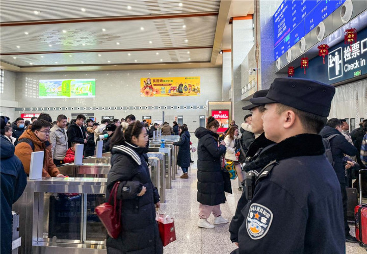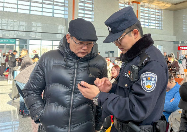 2月4日,呼和浩特铁路公安局包头公安处民警在巴彦淖尔站候车大厅内执勤。当日是春节假期最后一天,迎来春节返程客流高峰,为保障返程旅客安全出行,呼和浩特铁路公安局包头公安处下辖区各派出所加强站内巡逻检查,维护治安秩序,保障旅客平安返程。